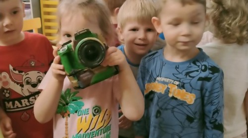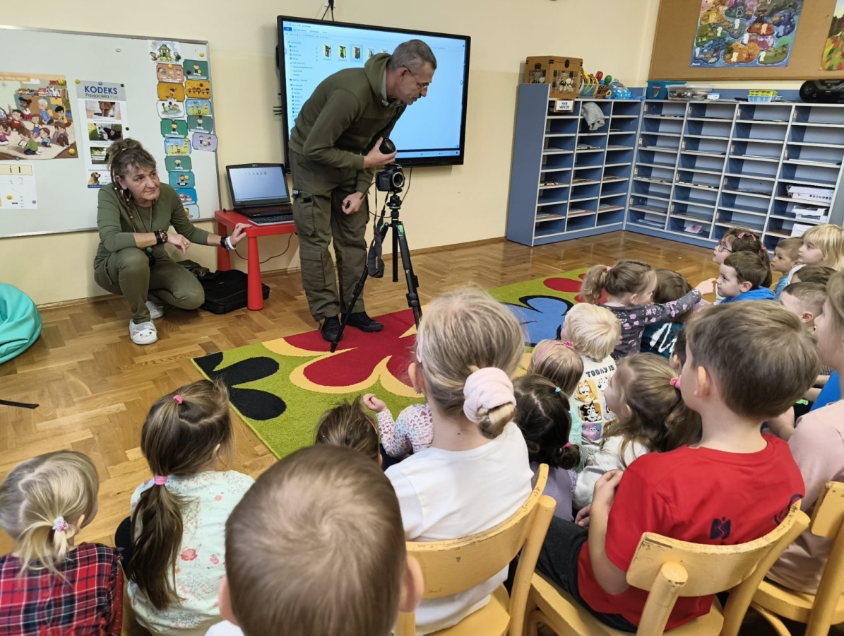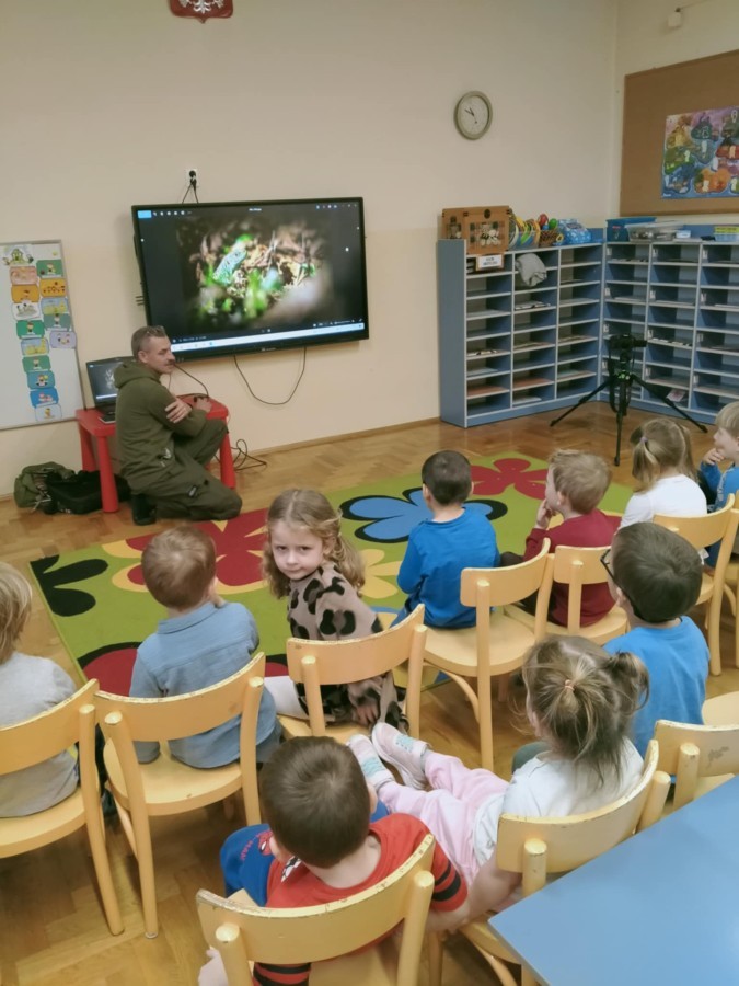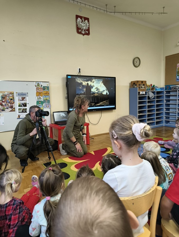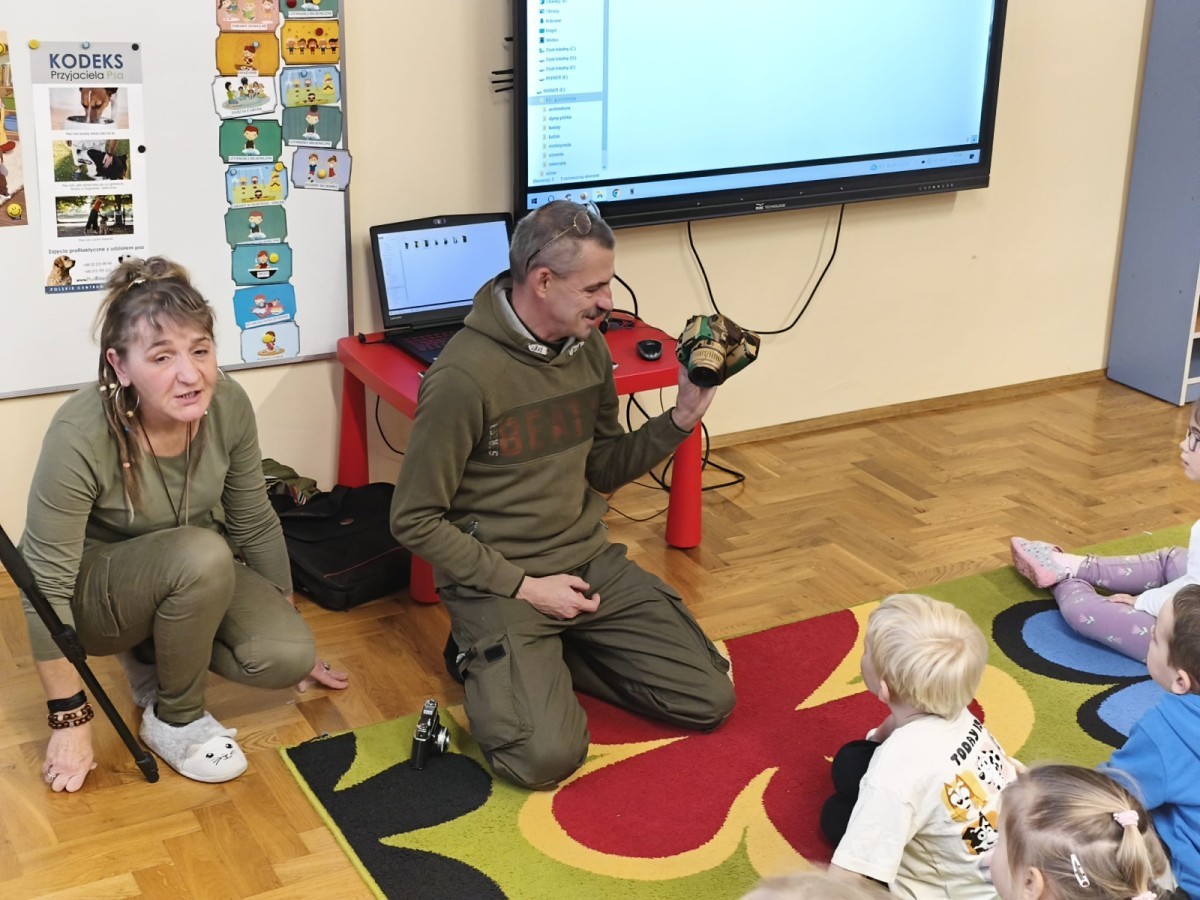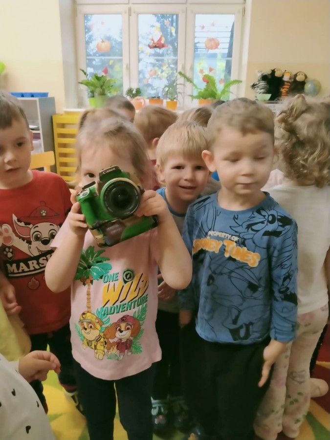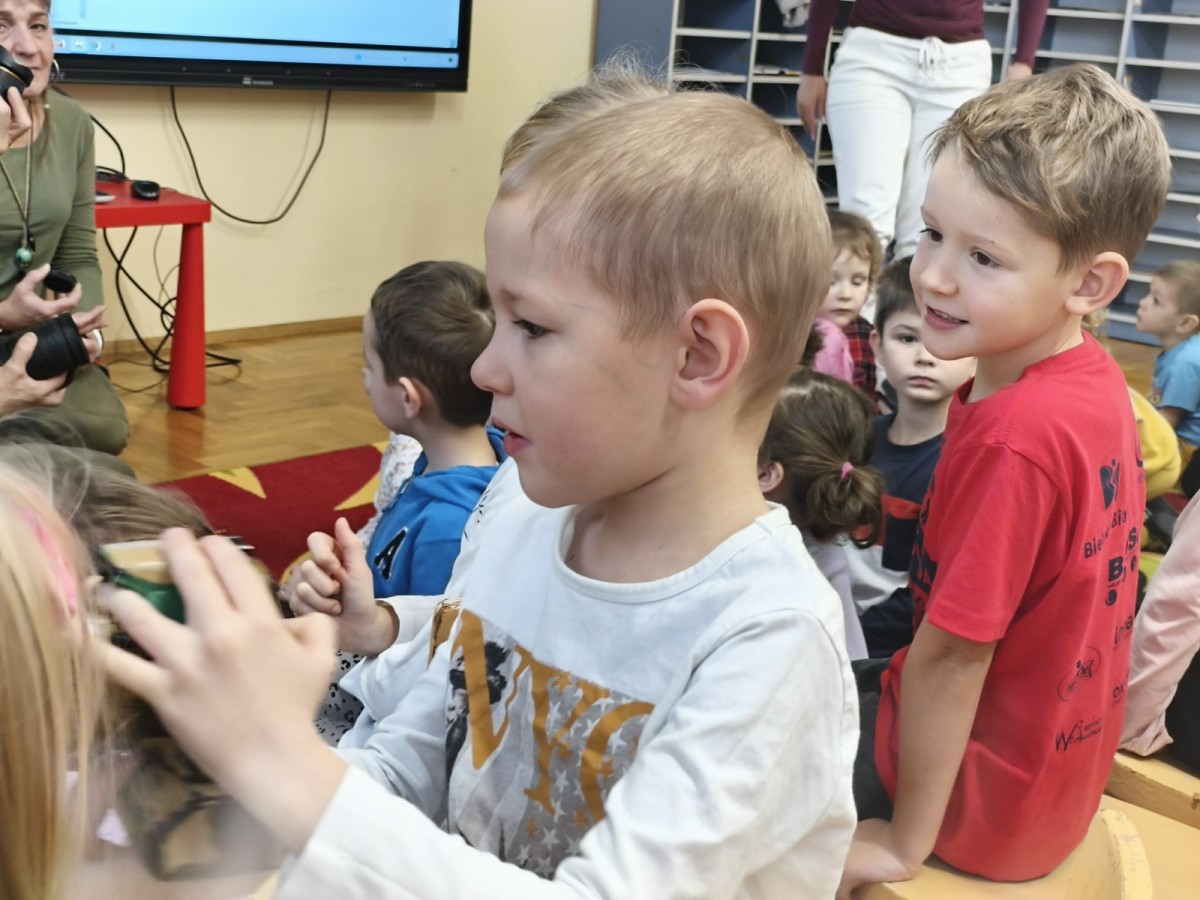 W poniedziałek 17 listopada nasze przedszkole odwiedziła para fotografów.📷 Nasi podopieczni mieli okazję obejrzeć na dużym ekranie niezwykłe zdjęcia,👀 bo przecież np. po kałużach💦 się świetnie skacze, ale żeby tam ciekawych ujęć szukać! A te pieski, lisy, owady pokazane w powiększeniu - naprawdę było co oglądać.😀 Największym zainteresowaniem cieszyły się jednak aparaty fotograficzne, które można było wziąć do ręki, a także filtry fotograficzne, przez które świat wyglądał jakoś inaczej.📷 Bardzo dziękujemy państwu Barskim za przyjazd i prezentację.😀