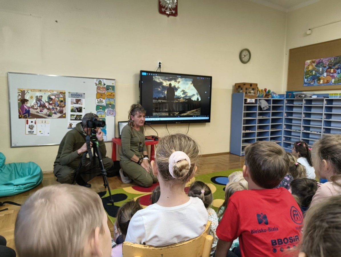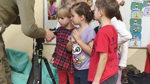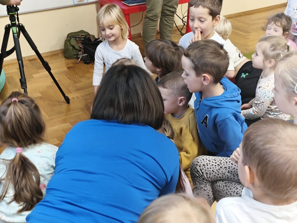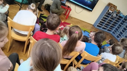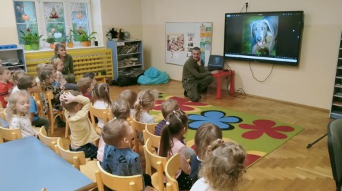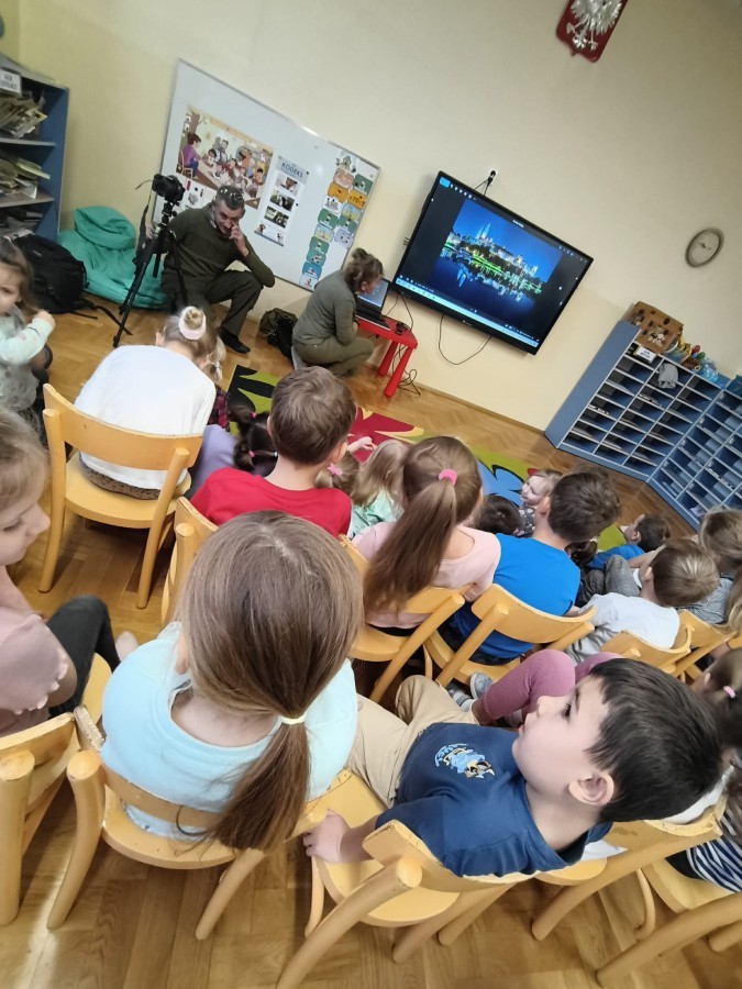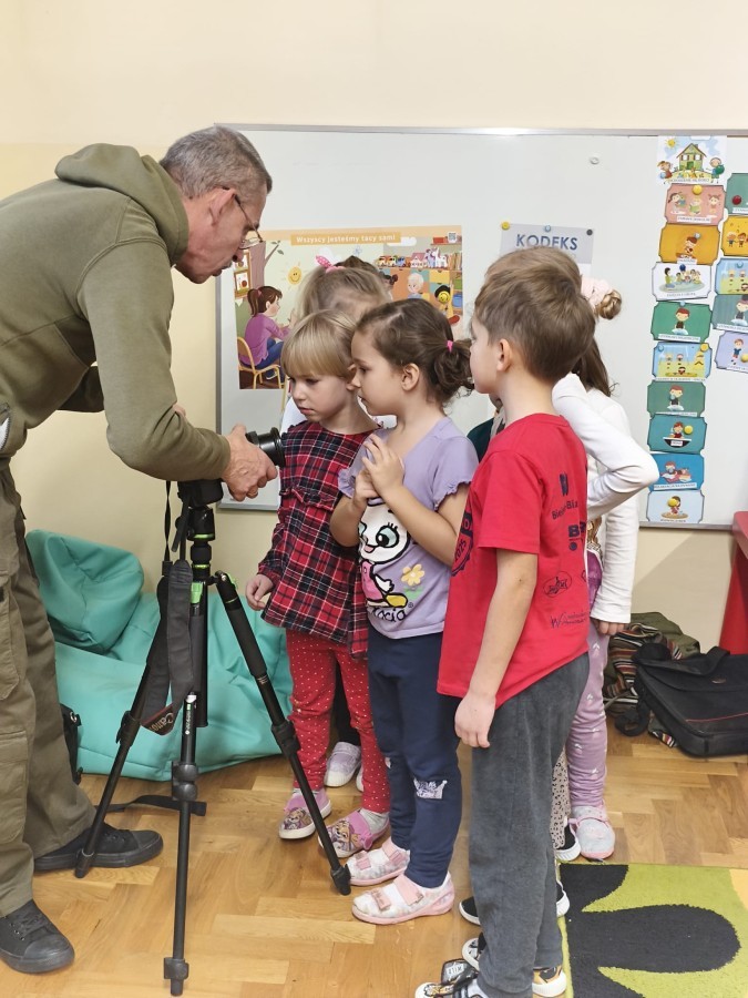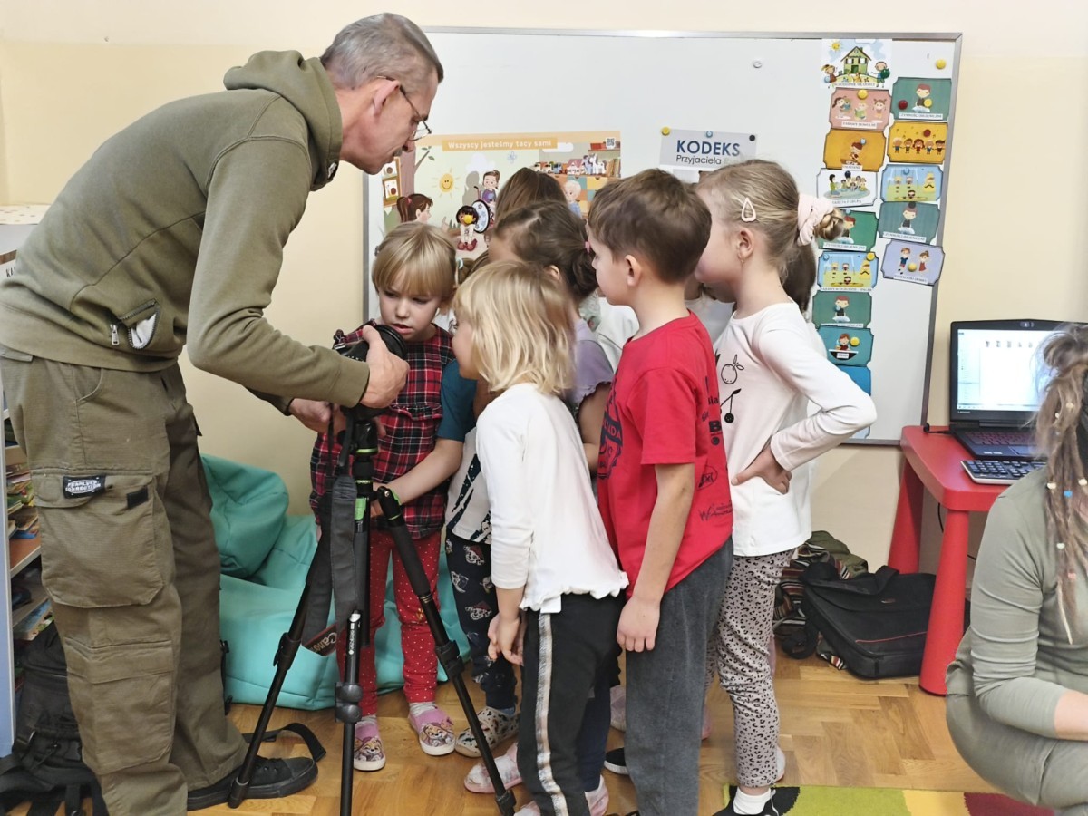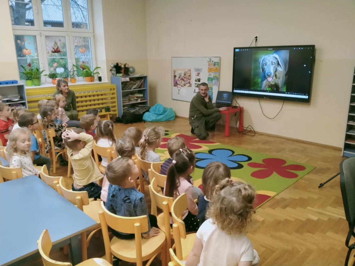 W poniedziałek 17 listopada nasze przedszkole odwiedziła para fotografów.📷 Nasi podopieczni mieli okazję obejrzeć na dużym ekranie niezwykłe zdjęcia,👀 bo przecież np. po kałużach💦 się świetnie skacze, ale żeby tam ciekawych ujęć szukać! A te pieski, lisy, owady pokazane w powiększeniu - naprawdę było co oglądać.😀 Największym zainteresowaniem cieszyły się jednak aparaty fotograficzne, które można było wziąć do ręki, a także filtry fotograficzne, przez które świat wyglądał jakoś inaczej.📷 Bardzo dziękujemy państwu Barskim za przyjazd i prezentację.😀