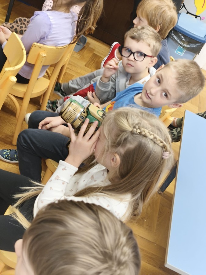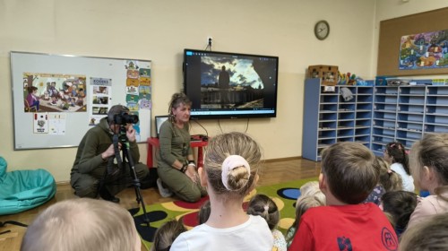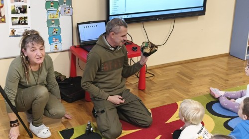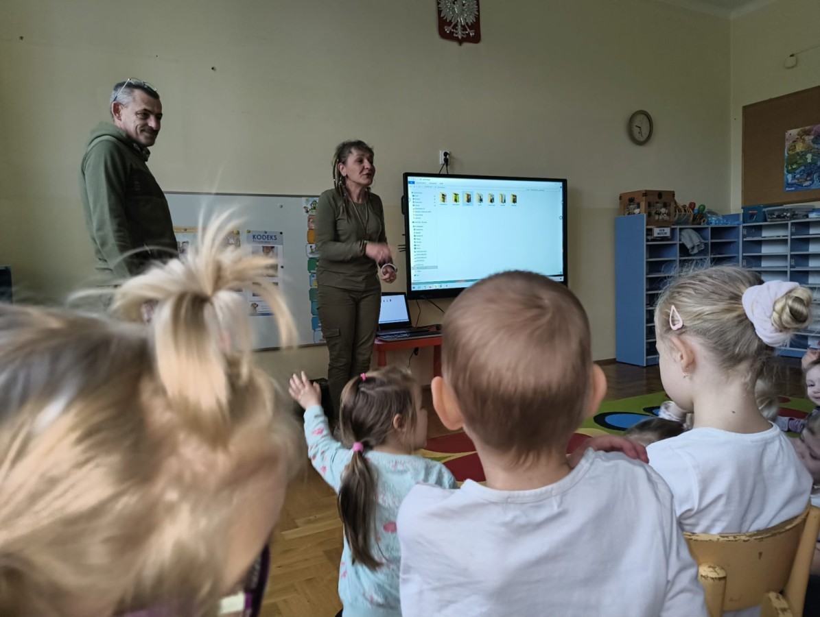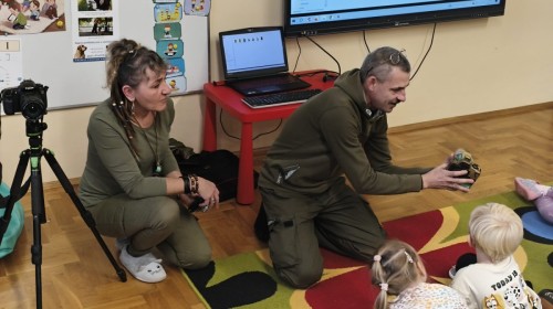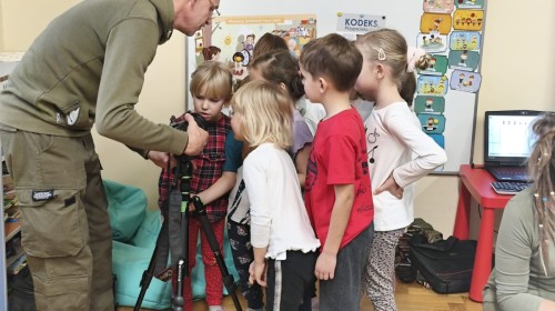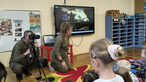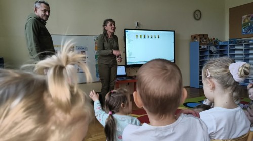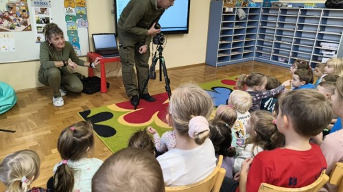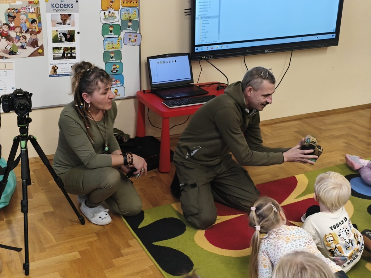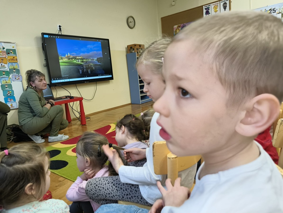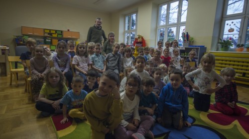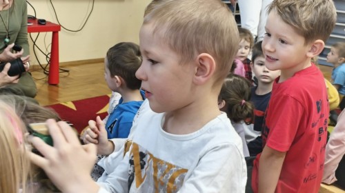 W poniedziałek 17 listopada nasze przedszkole odwiedziła para fotografów.📷 Nasi podopieczni mieli okazję obejrzeć na dużym ekranie niezwykłe zdjęcia,👀 bo przecież np. po kałużach💦 się świetnie skacze, ale żeby tam ciekawych ujęć szukać! A te pieski, lisy, owady pokazane w powiększeniu - naprawdę było co oglądać.😀 Największym zainteresowaniem cieszyły się jednak aparaty fotograficzne, które można było wziąć do ręki, a także filtry fotograficzne, przez które świat wyglądał jakoś inaczej.📷 Bardzo dziękujemy państwu Barskim za przyjazd i prezentację.😀