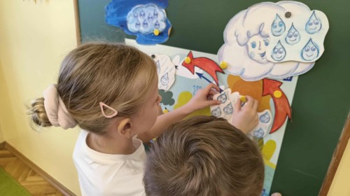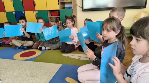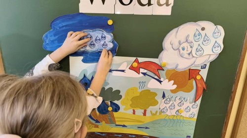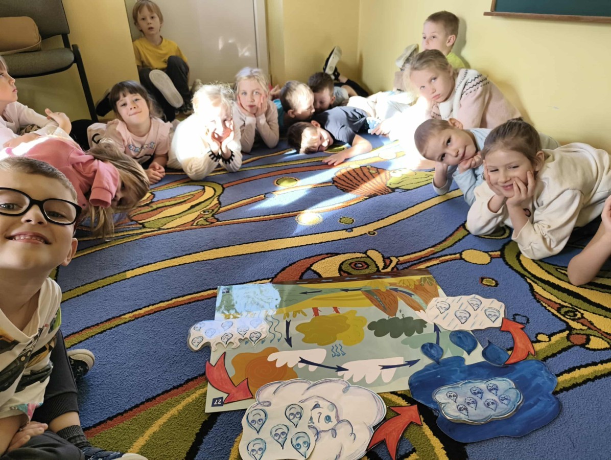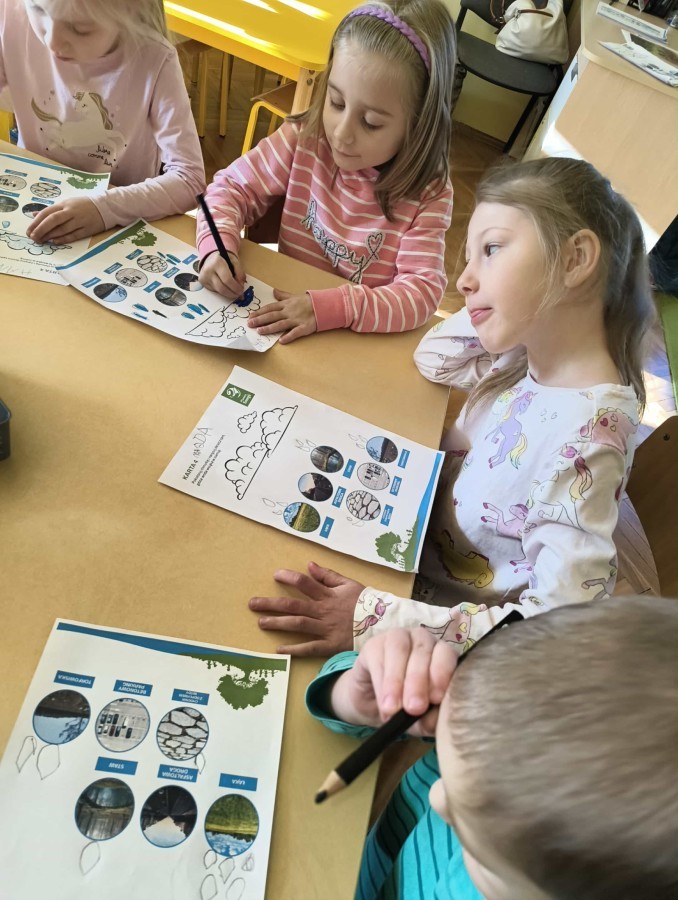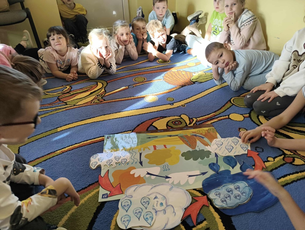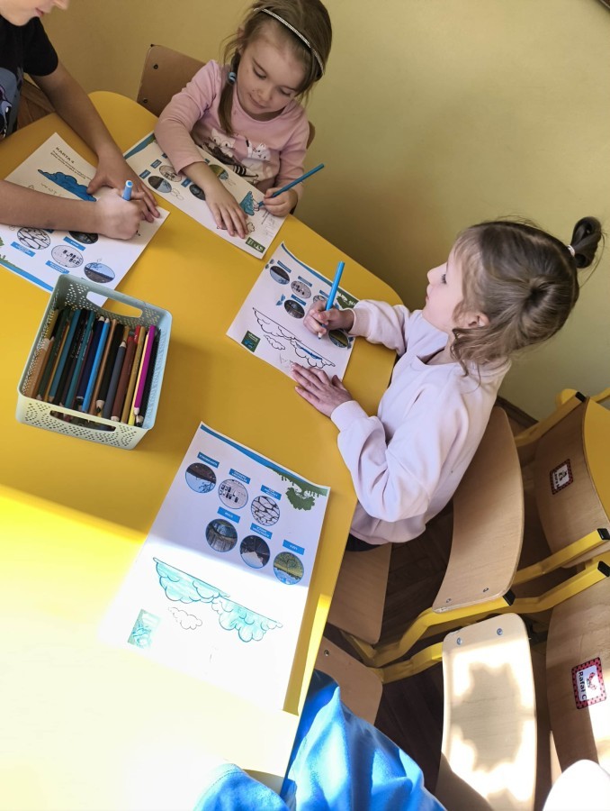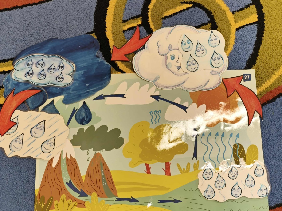 Dowiedziały się, że człowiek w większości składa się z wody, cała przyroda która nas otacza składa się z wody.💦 Bez wody nie było by życia na naszej planecie 🌏 i zamiast pięknej niebiesko – zielonej kuli widzianej z kosmosu byłaby tylko pustynia z górami, szara, zimna i nie nadająca się do życia. Zapoznały się schematem obiegu wody💦w przyrodzie. W oparciu o kolorowe plansze oraz elementy ruchome. Dzięki czemu dzieci mogły same manipulowały elementami przy układaniu „obiegu wody.” Na koniec wspólnie ułożyliśmy na kratownicy z wykorzystaniem kolorowych kartoników obieg „wody w przyrodzie”. W wolnych chwilach dzieci kolorowały kartę pracy nr 2. Sprawiła ona im wiele radości.
