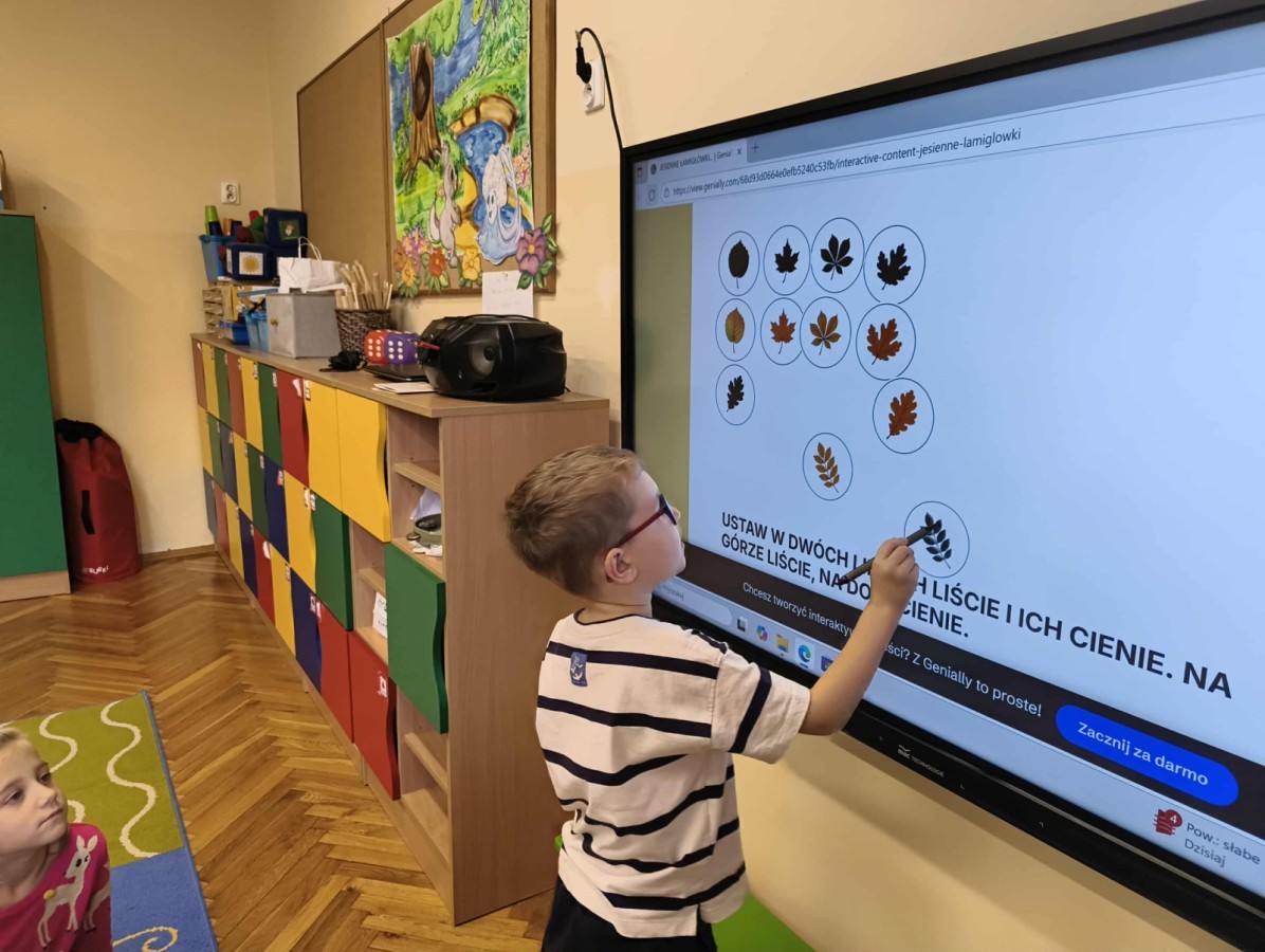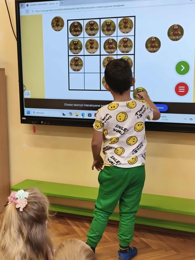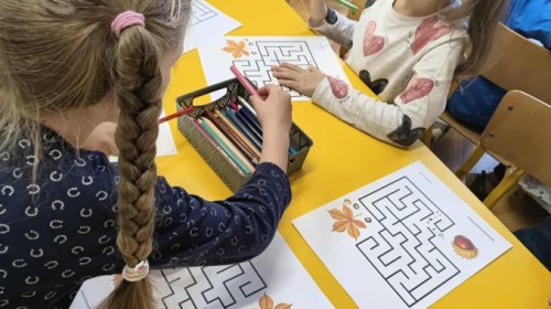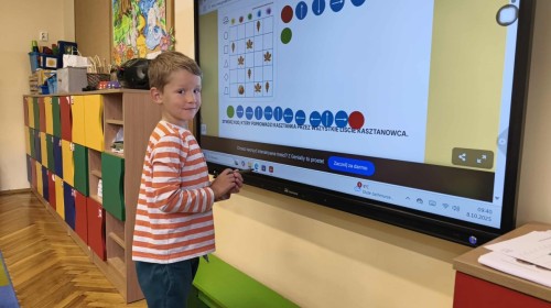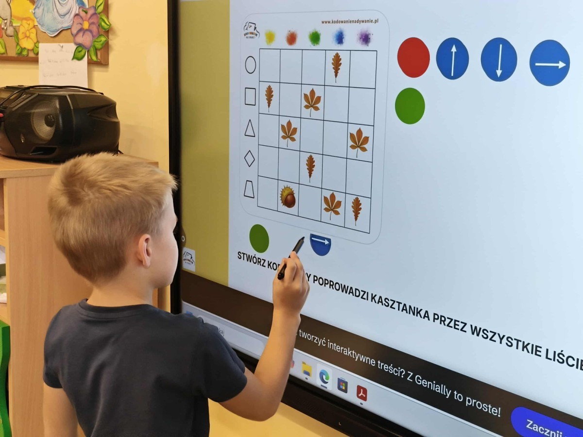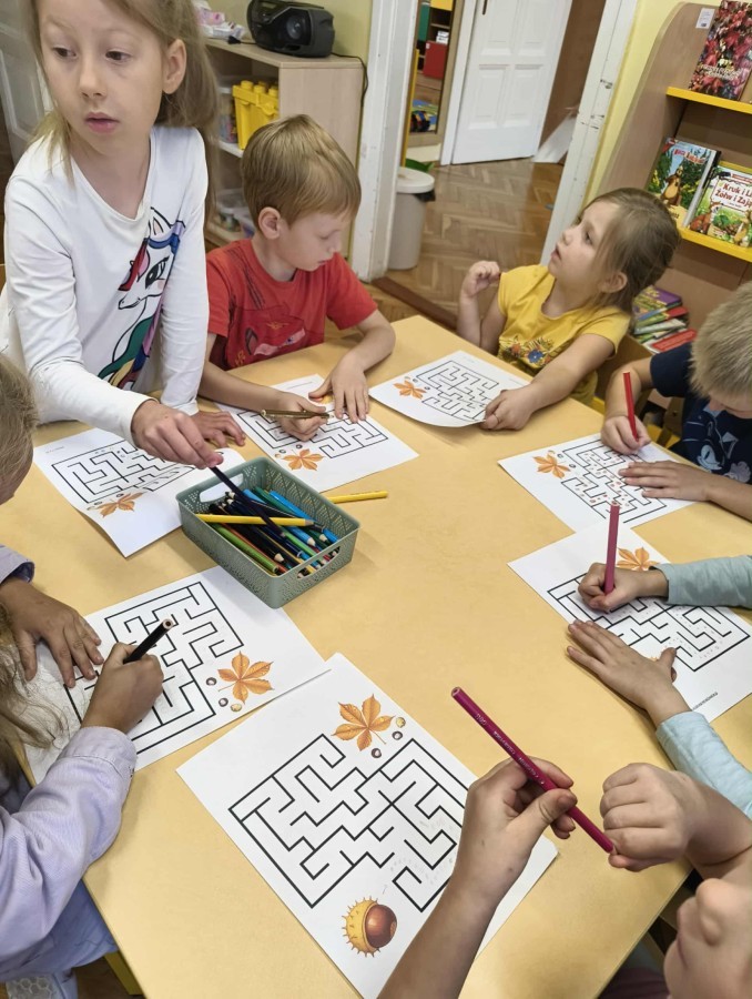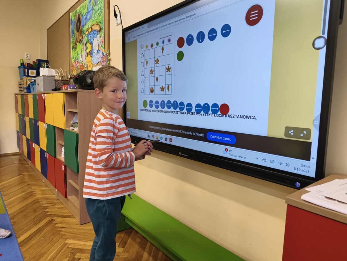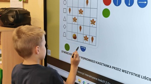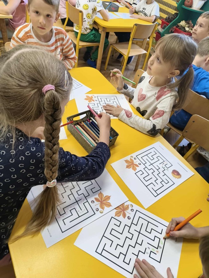 Kolorowa jesień,🟠🟡🟤 spadające liście🍁 i kasztany🌰 czyli skarby jesieni🍂 były tematem naszego spotkania z kodowaniem.🎲 Zadaniem dzieci było ułożenie kasztanowych ludzików obrazkowego sudoku na tablicy interaktywnej oraz w karcie pracy przy stoliku.🌰 Szukaliśmy cieni liści jesiennych, zbieraliśmy liście kasztana tworząc kod który poprowadzi kasztanka przez wszystkie pola, na których znajduj si liście kasztanowca i dębu.🍁 Na koniec w kartach pracy szukaliśmy drogi w labiryncie dla kasztanka, który szukał drogi by spotkać się z kasztanowymi przyjaciółmi.😀 Wszystko się nam udało wykonać.
