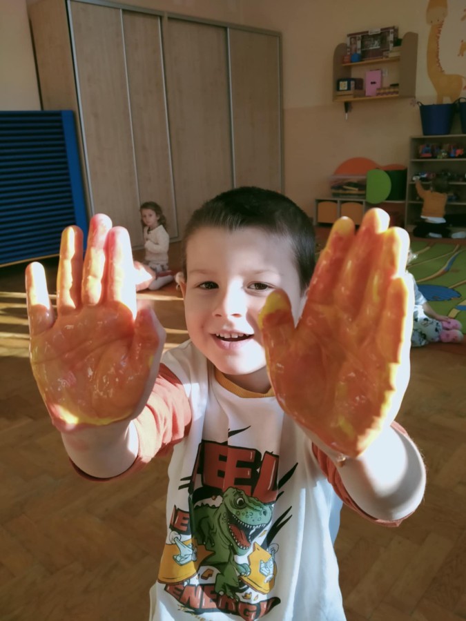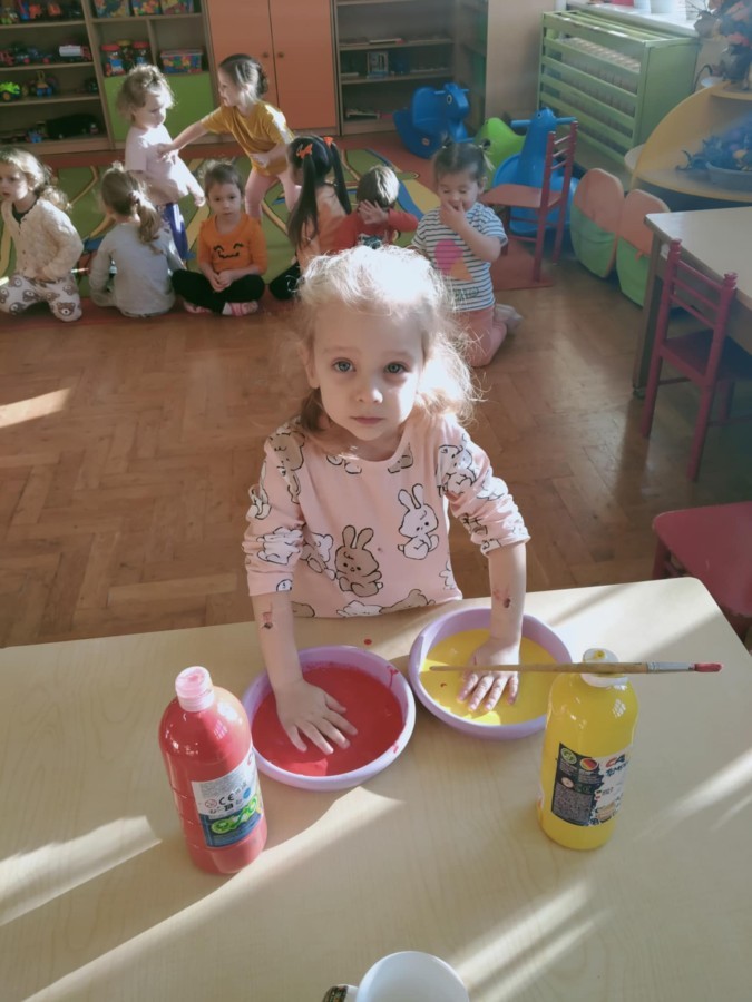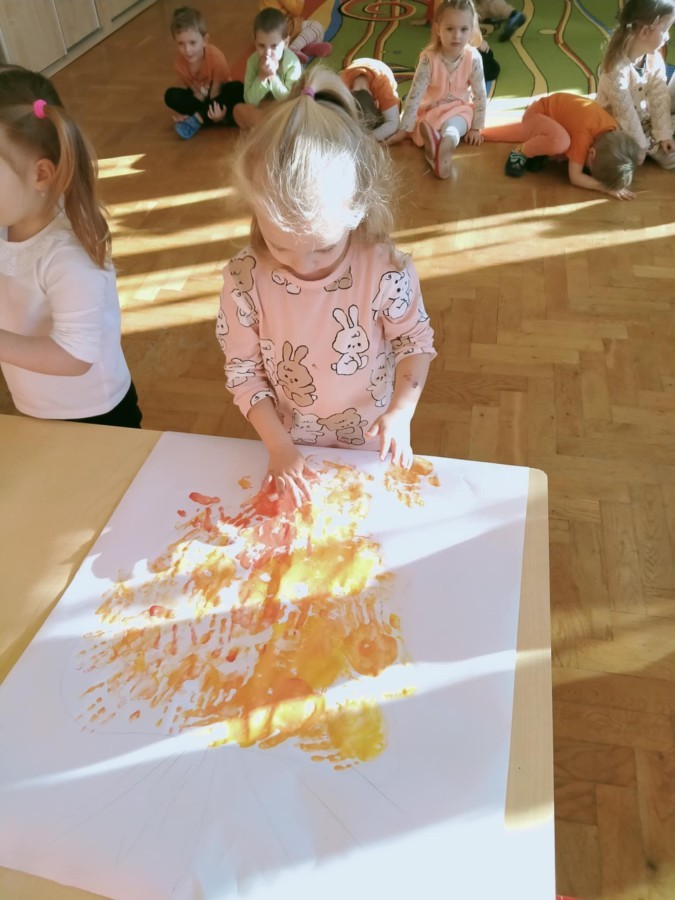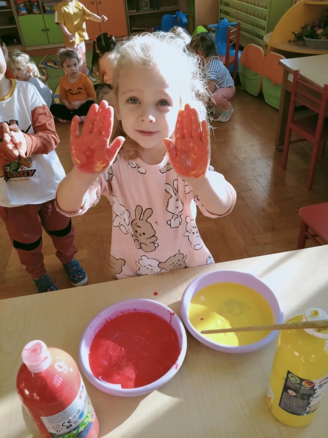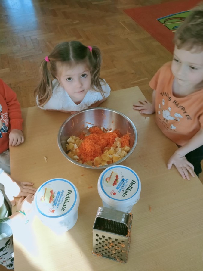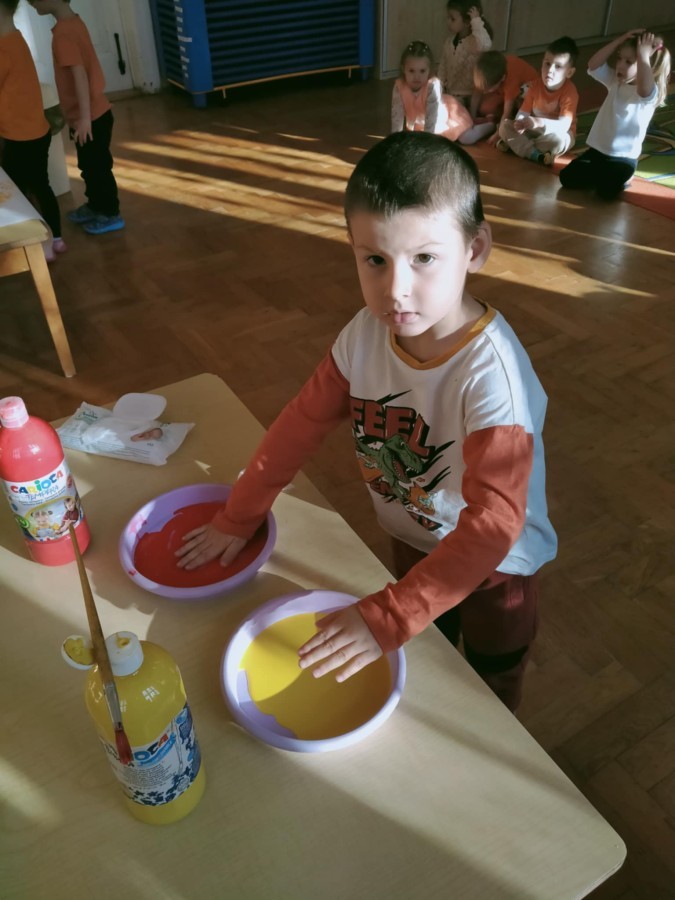 Pomarańczowy wtorek u Stokrotek🌼 obfitował w ciekawe aktywności. Stokrotki🌼 zrobiły sałatkę z pomarańczowego warzywa - marchewki🥕 oraz z pomarańczowej pomarańczy🍊Dzieciom bardzo smakowała zdrowa sałatka,🥗 dokładki były mile widziane. Dzieci przekonały się, z jakich kolorów powstaje barwa pomarańczowa, odbiły swoje rączki na sylwecie marchewki,🥕 tańczyły do piosenki o pomarańczy Paoli🥕 i rozwiązywały zagadki.❓ Oczywiście zabawa w liski też musiała być punktem programu😀