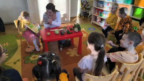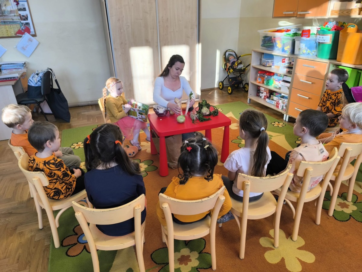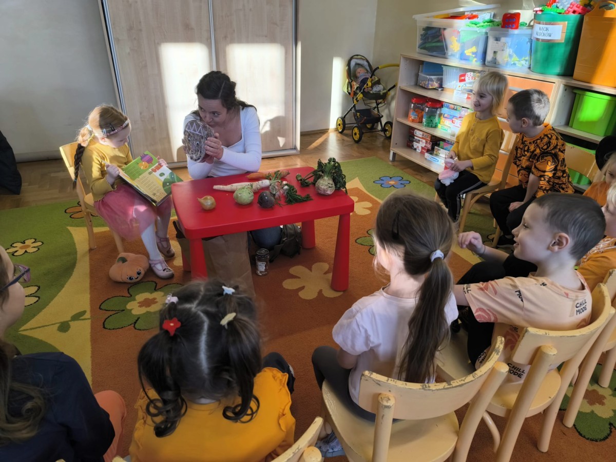 W piątek 30 listopada naszą grupę odwiedziła mama Igusi.😀 Przyniosła ze sobą piękną niespodziankę – przeczytała dzieciom znany i lubiany wiersz Jana Brzechwy „Na straganie”.🍅🍆🥦 Podczas czytania pani Kasia przedstawiła krótką inscenizację, w której warzywa „ożyły” wzbudzając wśród dzieci mnóstwo zaciekawienia i radości.👀😀