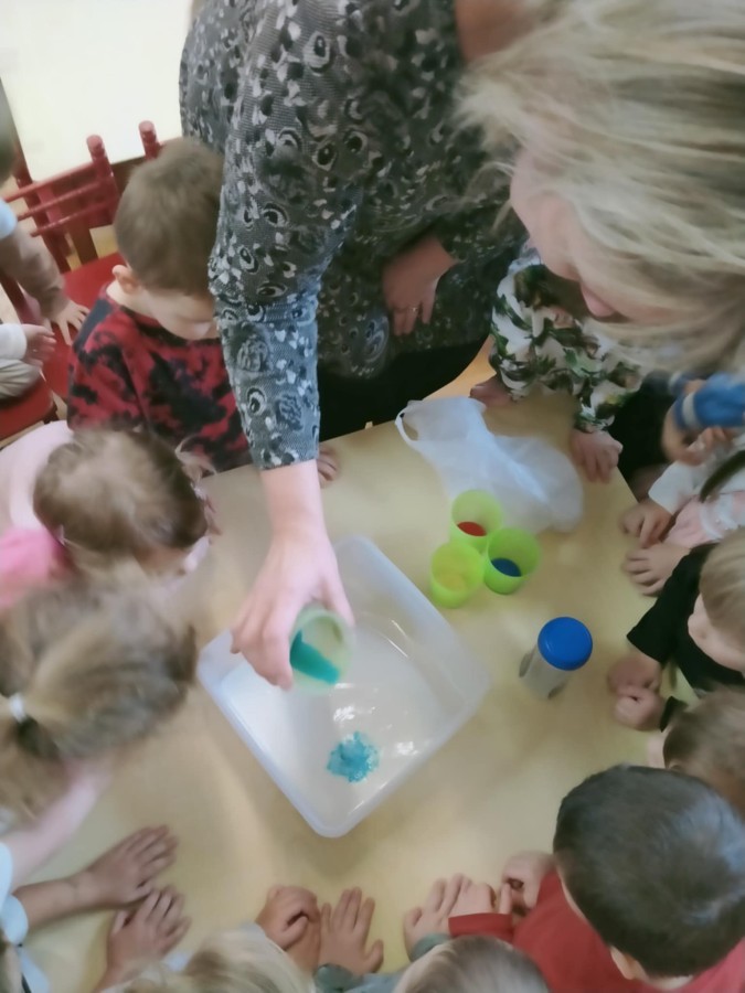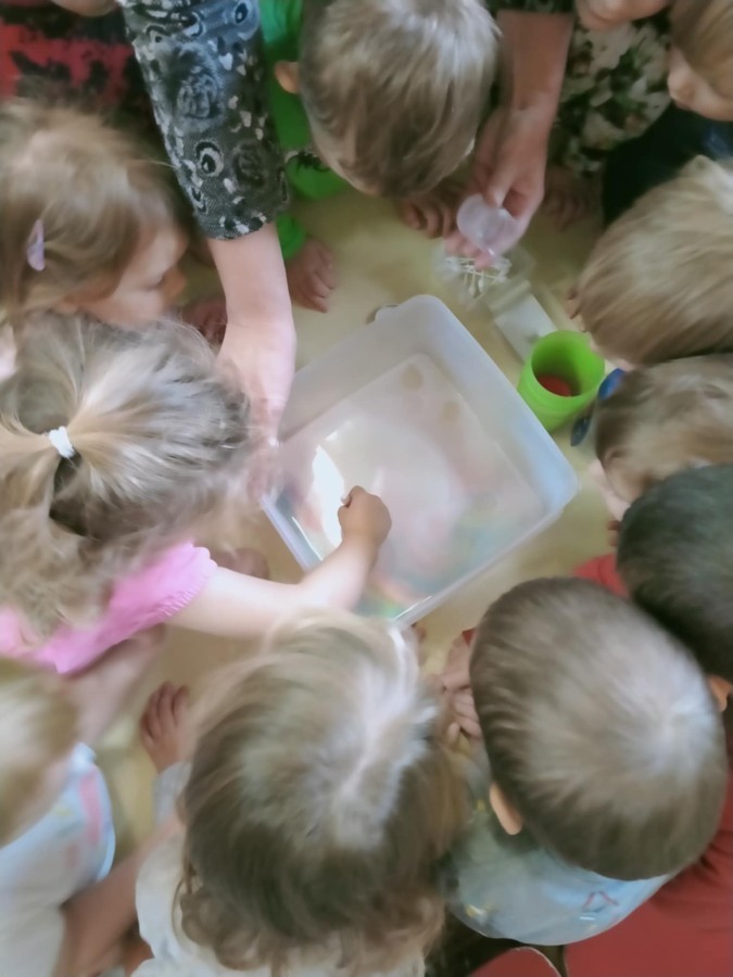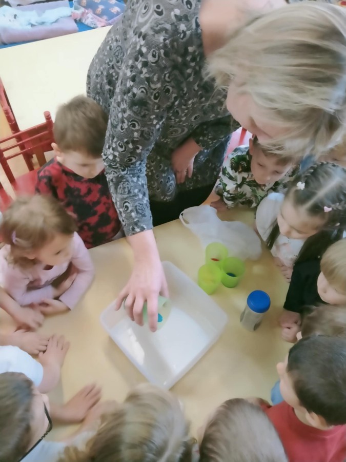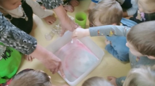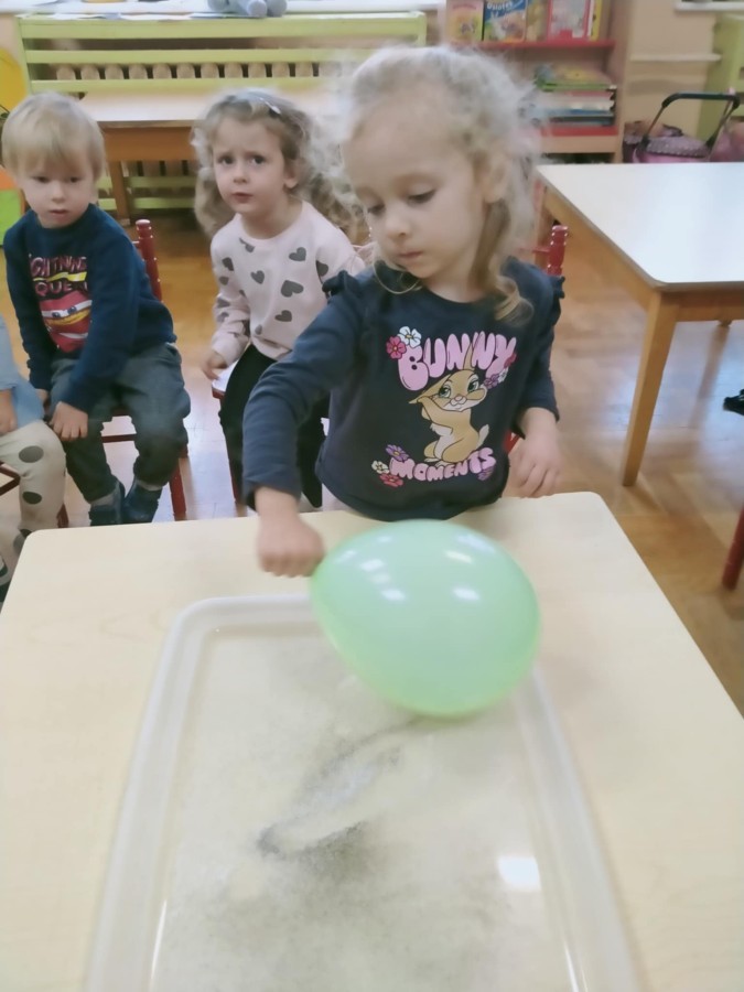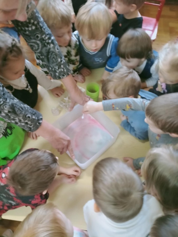 W ramach innowacji "Z nauką za pan brat" Stokrotki🌼 nauczyły się "malować" w mleku.🥛 Płyn do mycia naczyń odpychał tłuszcz zawarty w mleku, a wraz z nim barwniki uprzednio wlane do pojemnika, wskutek czego na powierzchni płynu tworzyły się barwne kolaże.🟠🔴🔵😀 Stokrotki🌼 sprawdzały, czy da się oddzielić pieprz od soli. Okazało się, że włosy świetnie elektryzują balonik,🎈 który przyciąga lżejsze okruchy pieprzu. W każdym razie zabawy było wiele 😀.