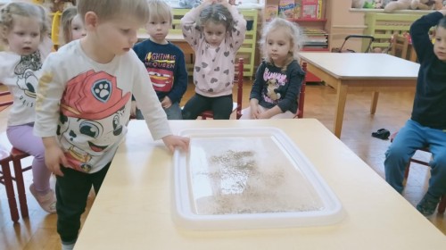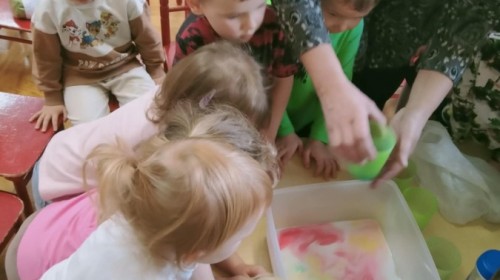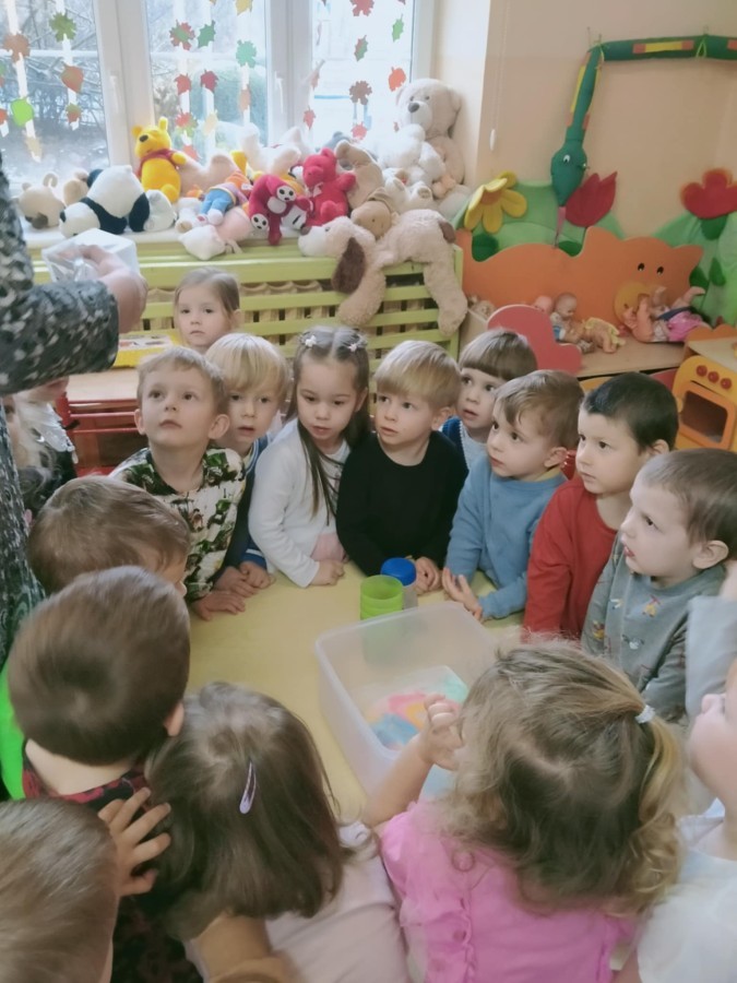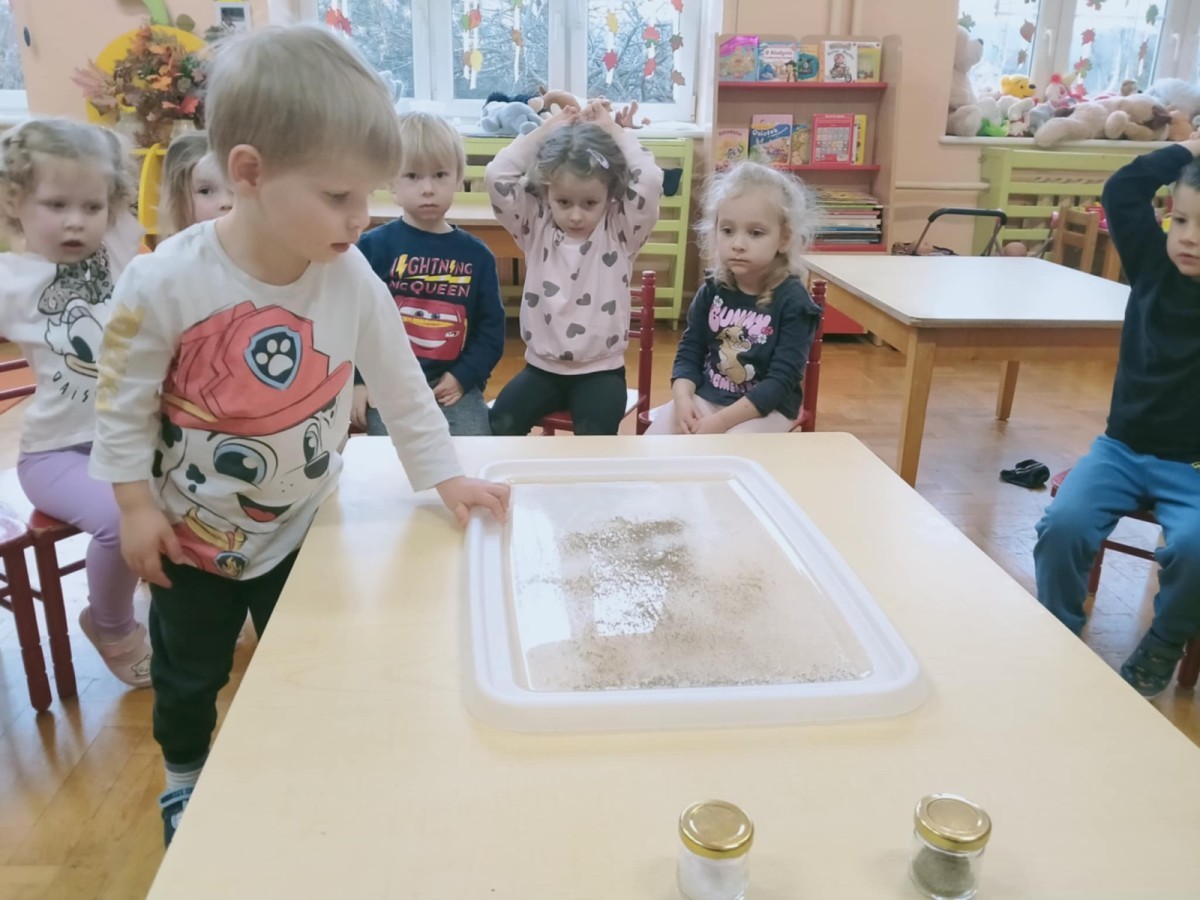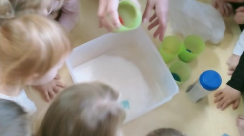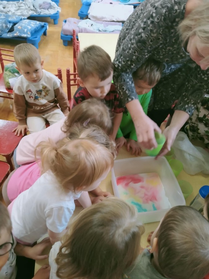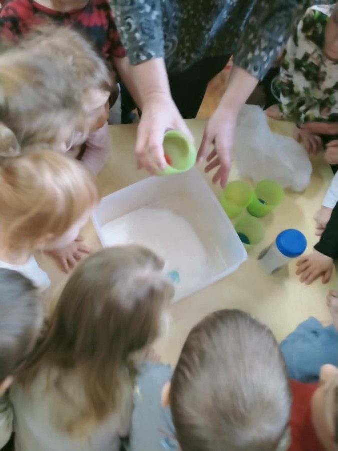 W ramach innowacji "Z nauką za pan brat" Stokrotki🌼 nauczyły się "malować" w mleku.🥛 Płyn do mycia naczyń odpychał tłuszcz zawarty w mleku, a wraz z nim barwniki uprzednio wlane do pojemnika, wskutek czego na powierzchni płynu tworzyły się barwne kolaże.🟠🔴🔵😀 Stokrotki🌼 sprawdzały, czy da się oddzielić pieprz od soli. Okazało się, że włosy świetnie elektryzują balonik,🎈 który przyciąga lżejsze okruchy pieprzu. W każdym razie zabawy było wiele 😀.