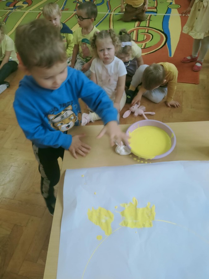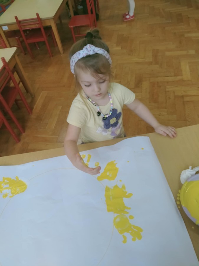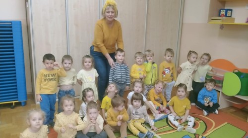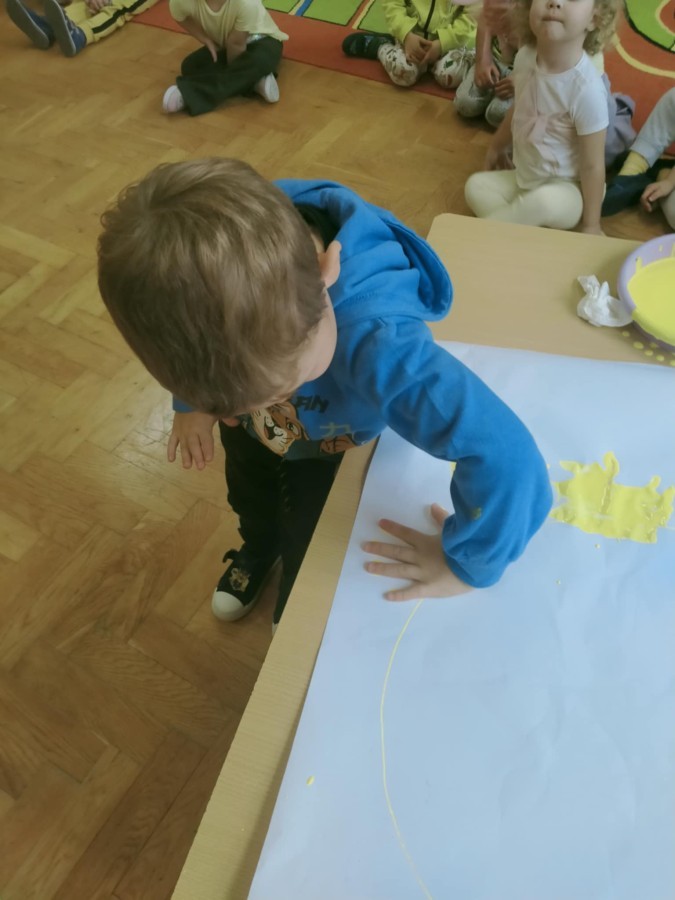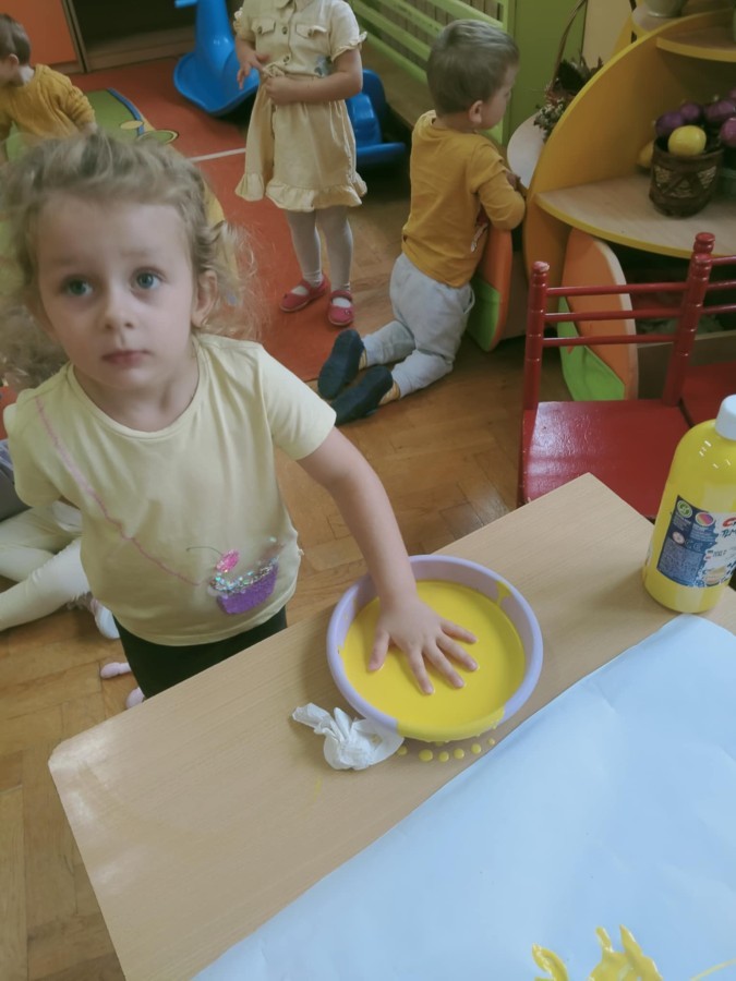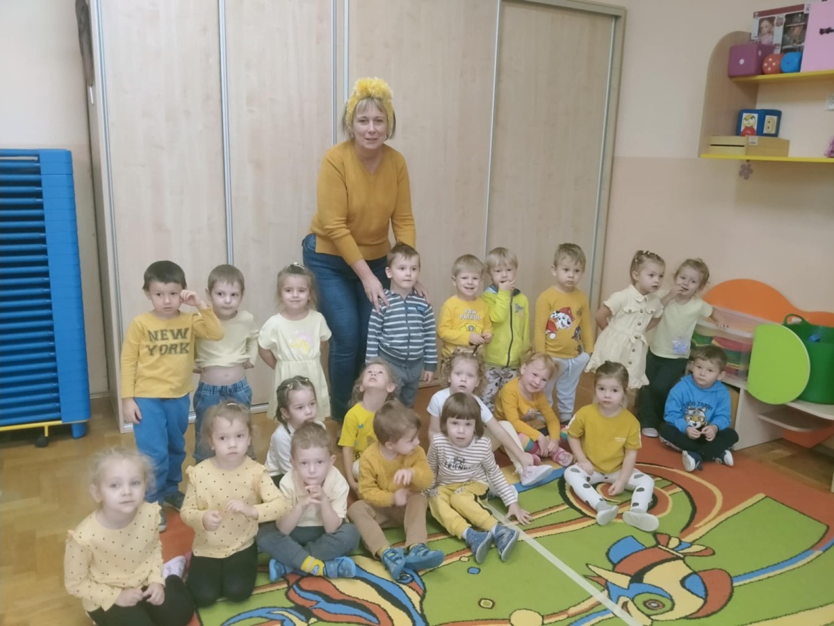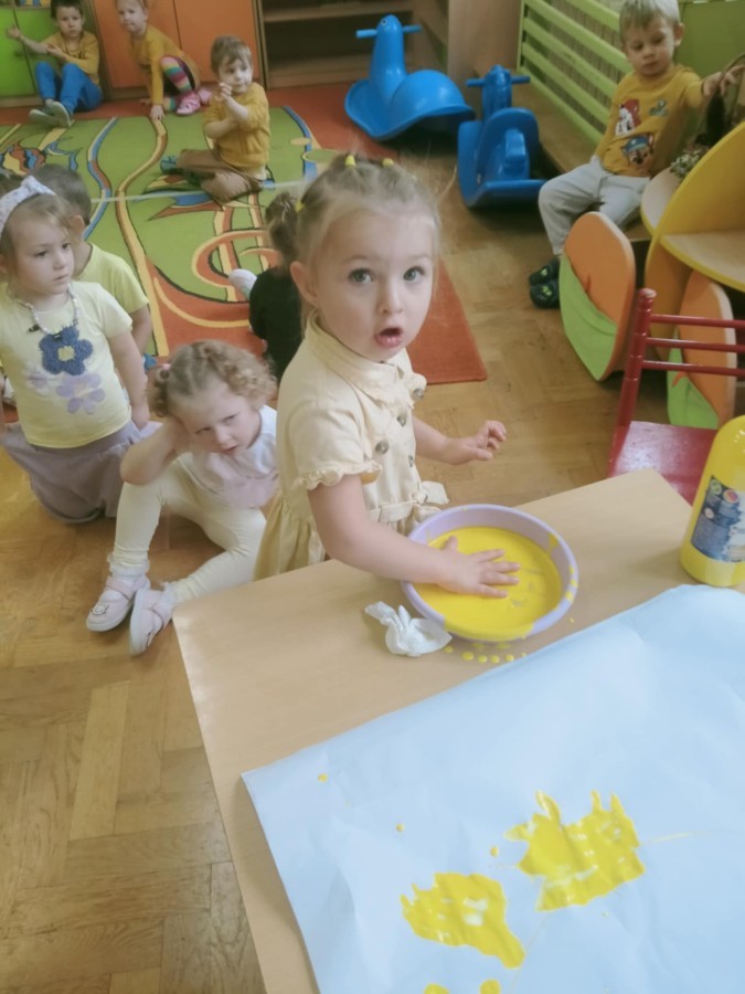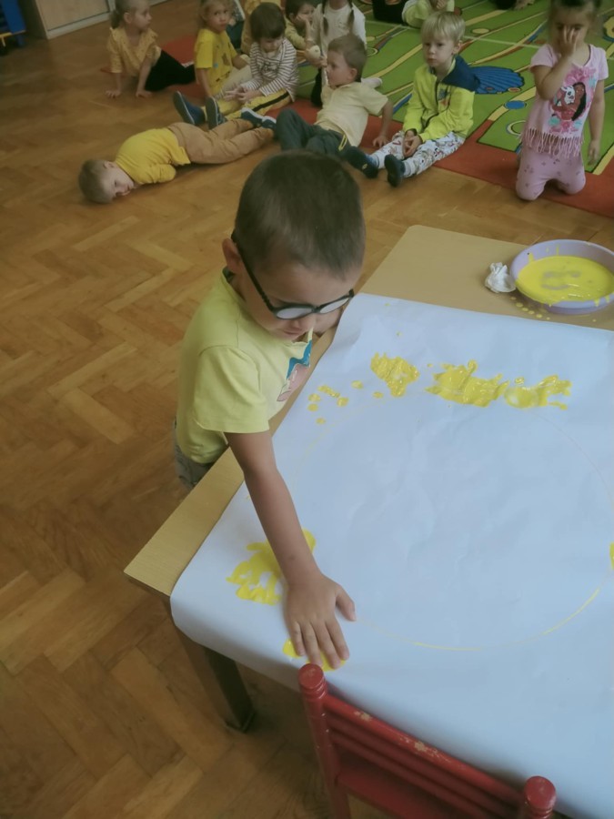 We wtorek nasze Stokrotki🌼 obchodziły Żółty Dzień🟡. Wszyscy mieli na sobie ubrania z czymś żółtym. Poznaliśmy żółty jesienny kwiat - słonecznik.🌻 Dzieci spróbowały żółtych owoców, które uprzednio same kroiły na kawałki.🍋🍌🍈 I wielkie brawa👏👏👏 dla Stokrotek🌼, gdyż nie krzywiły się przy jedzeniu cytryny,🍋 a nawet wolały o jeszcze! Nasze najmłodsze przedszkolaczki wykonały słoneczko,🌞 malując je odciskami swoich rączek w żółtej farbie.🖐🟡 Na koniec gimnastykowaly się do dźwięków "Yellow Submarine" zespołu The Beatles "🎶😀